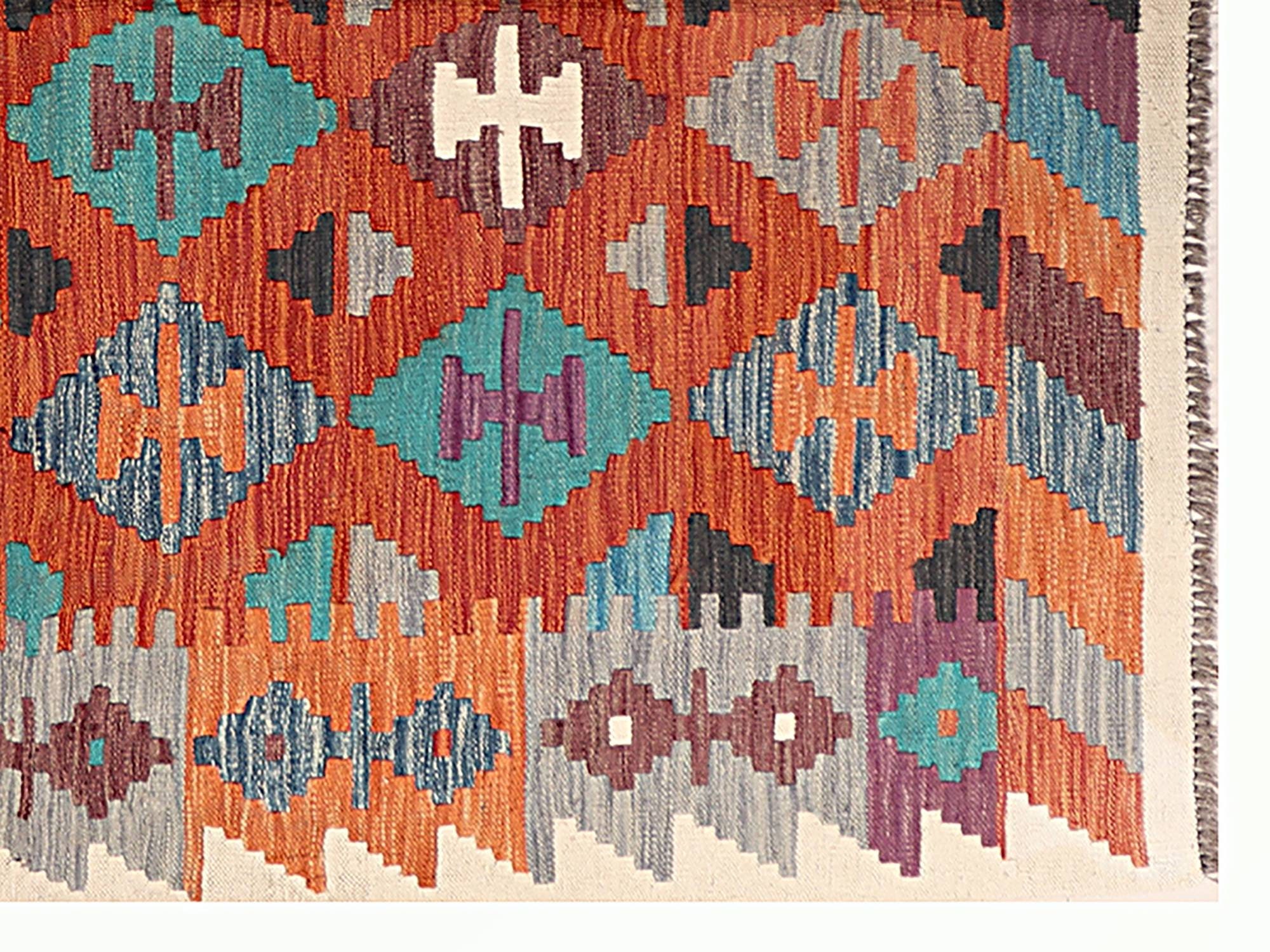 This rug is 100% handmade which makes it one of a kind and unique. Kilim rugs are contemporary rugs which can be used for both modern and traditional settings. They have reversible feature which means you can use both sides of the rug. Very hard wearing rug and a good value for money.
