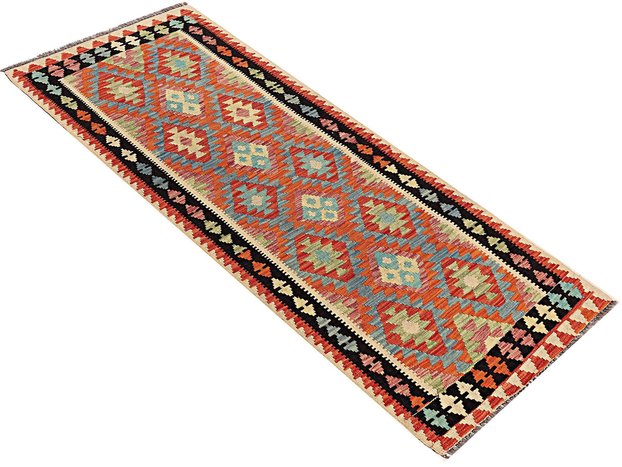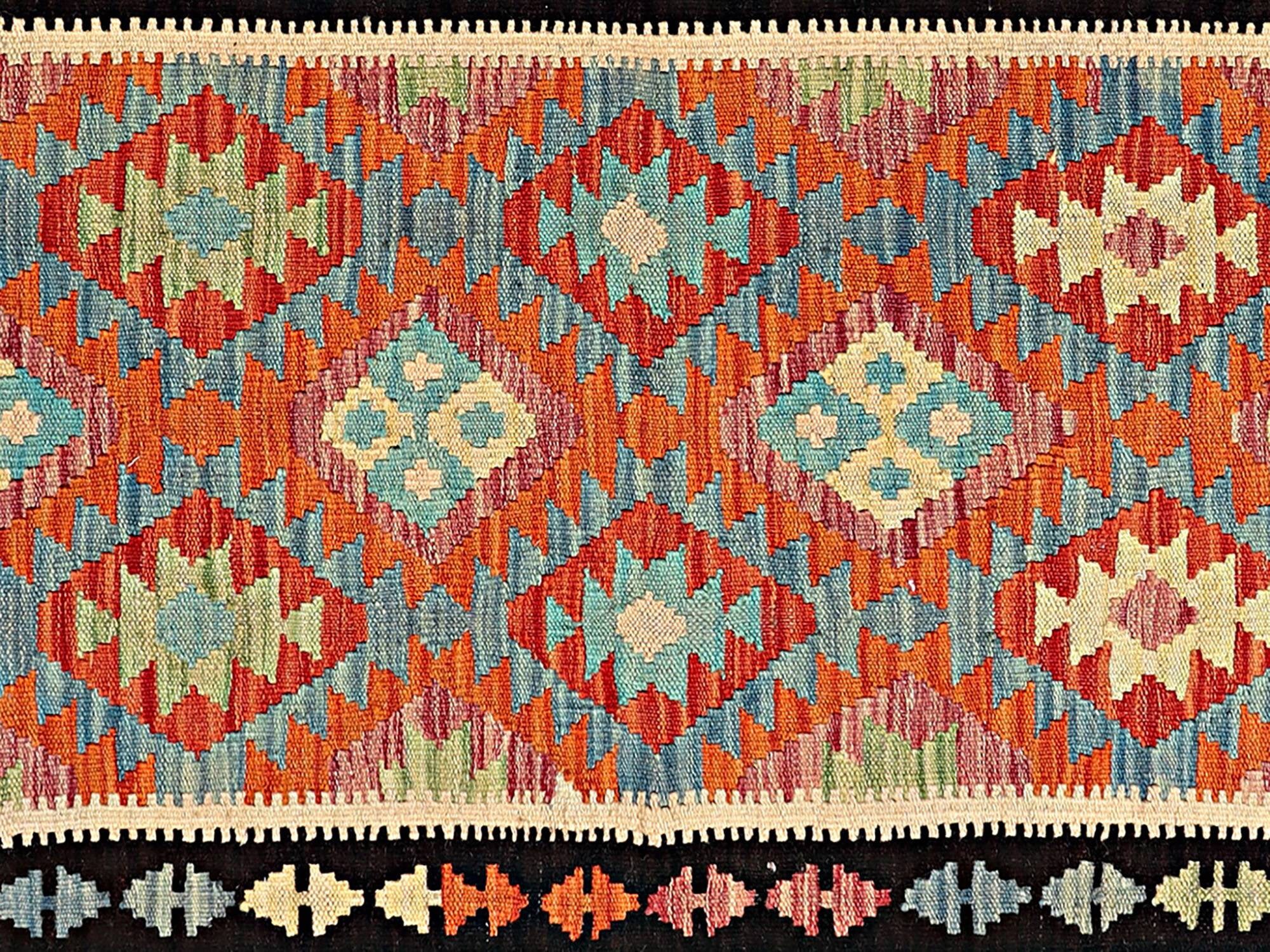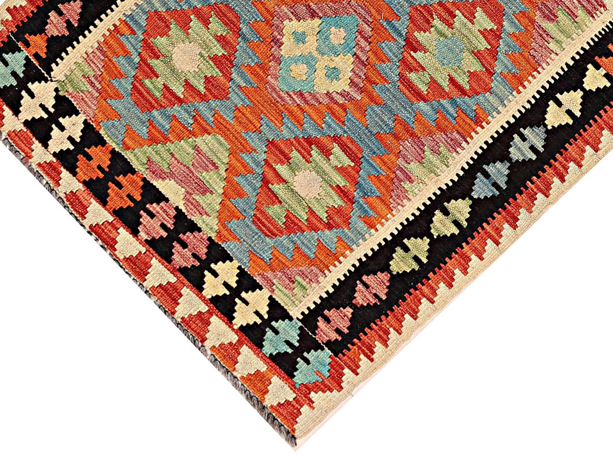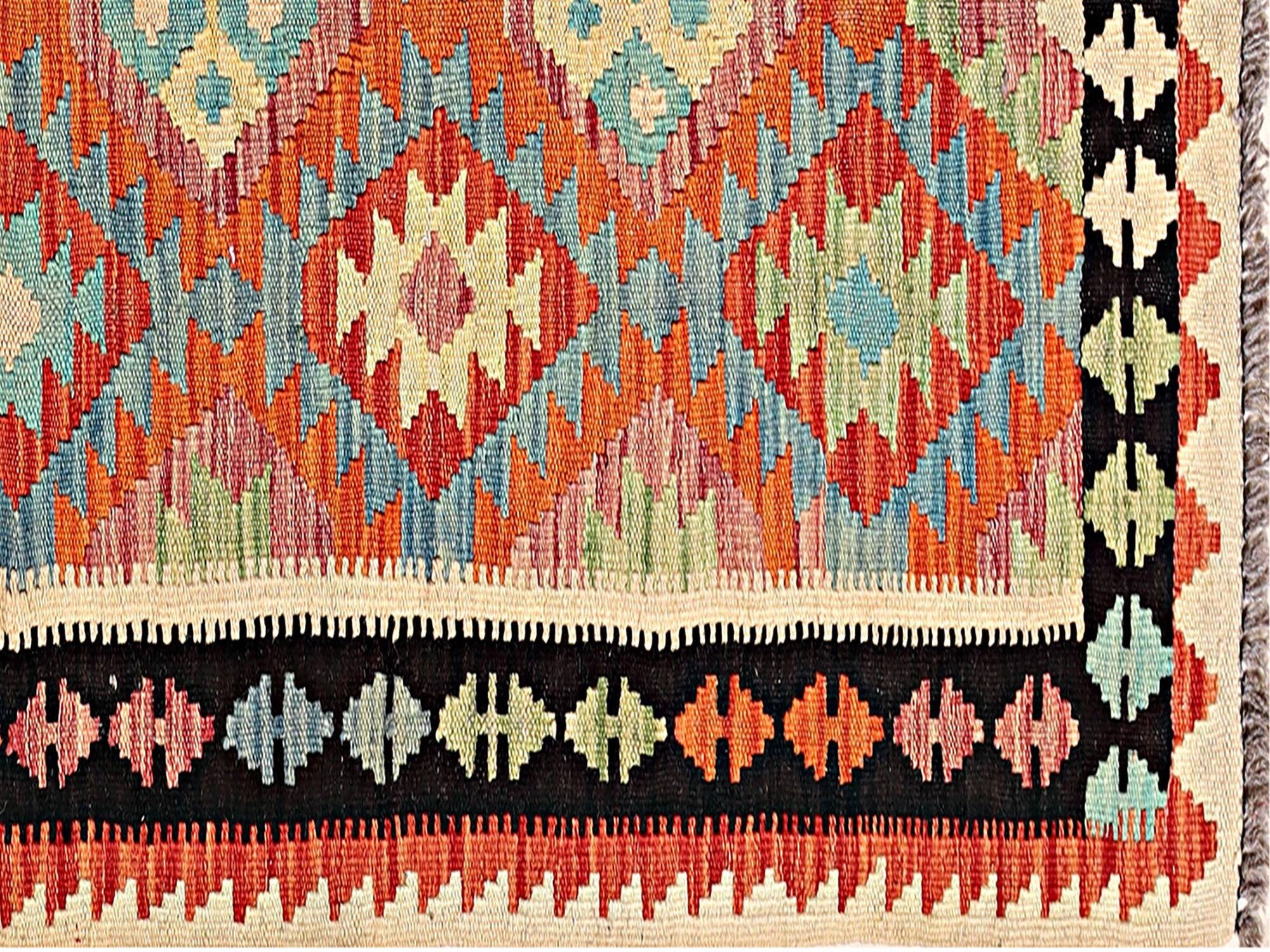 A brand new very high quality multicolour 100% handmade contemporary flatwoven traditional wool on wool Afghan kilim rug. Made using highest quality soft hand spun natural sheep wool and organic vegetable dyes. Traditional Asiatic nomadic weaving techniques were used to finish this beautiful piece of pure craftsmanship. Each and every rug is 100% handmade which makes them one of a kind and unique. Kilim rugs are contemporary rugs which can be used for both modern and traditional settings. They have reversible feature which means you can use both sides of the rug. Very hard wearing rug and a good value for money.