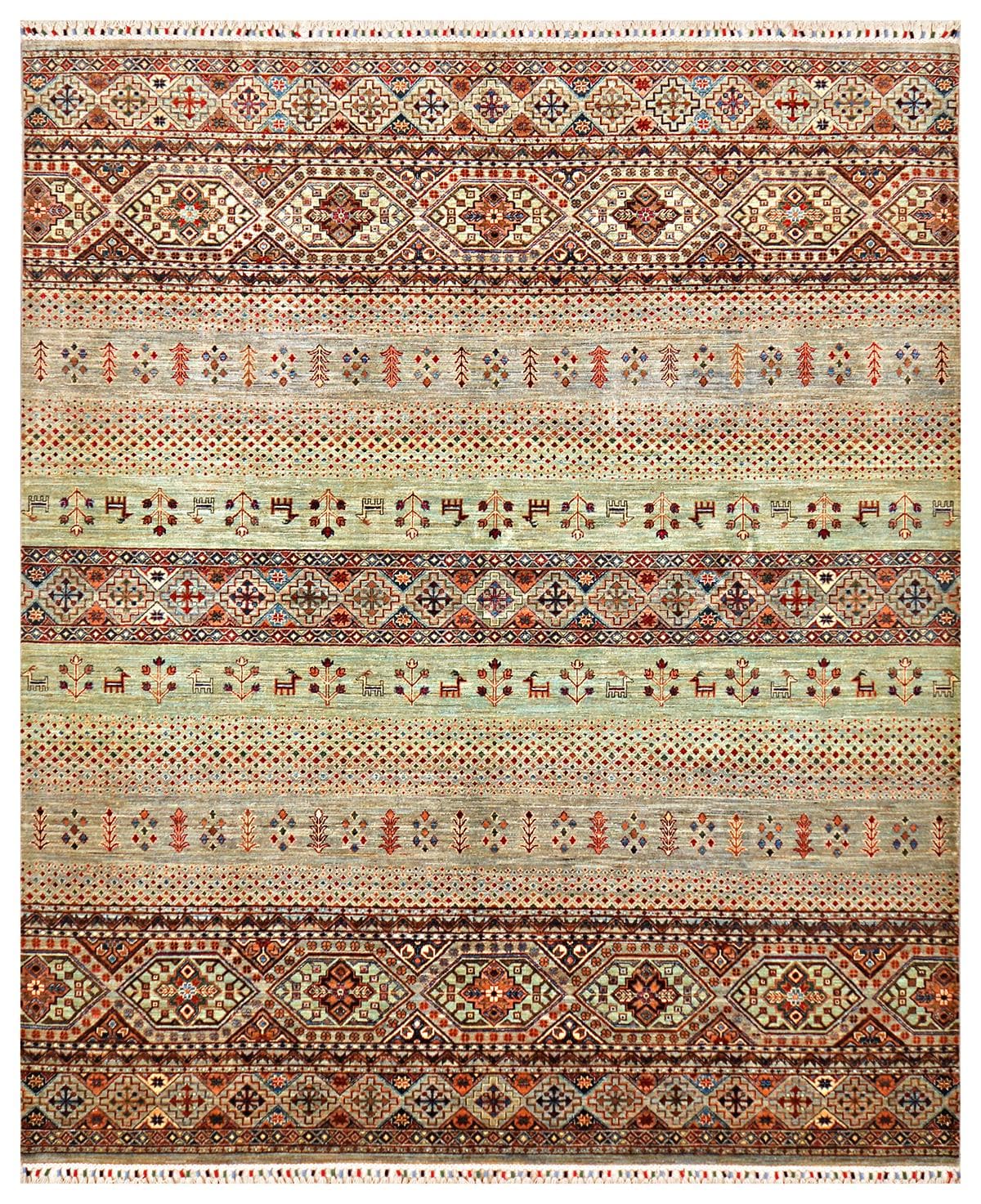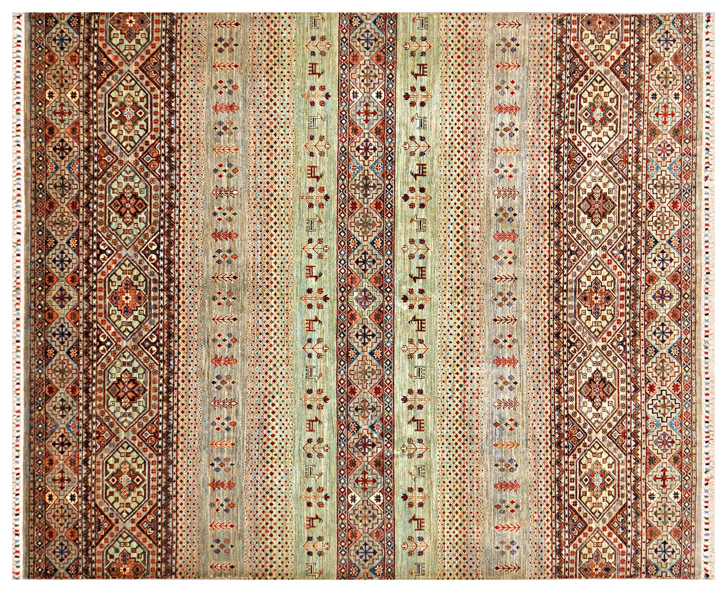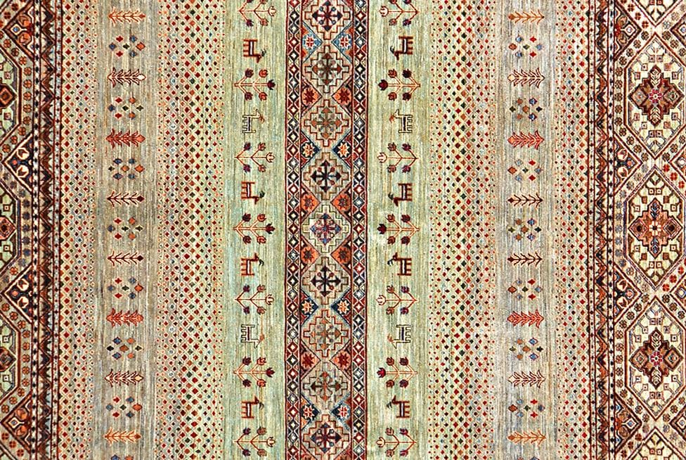 Large, intricately patterned rug with multiple borders and a repeating geometric design. The rug features a variety of colours including reds, blues, creams, and browns. This rug is 100% handmade which makes it one of a kind and unique. Khurjeen rugs can be used for both modern and traditional settings. Very hard-wearing rug and a good value for money.
