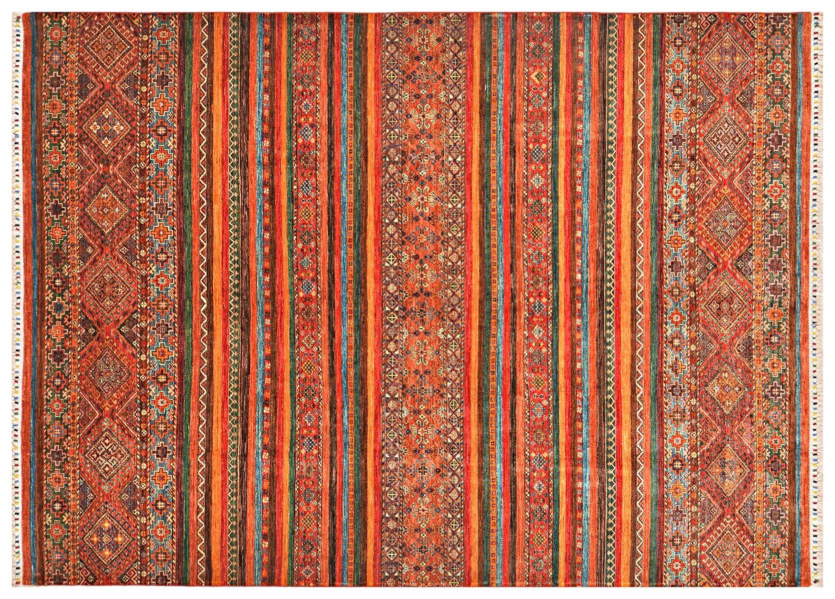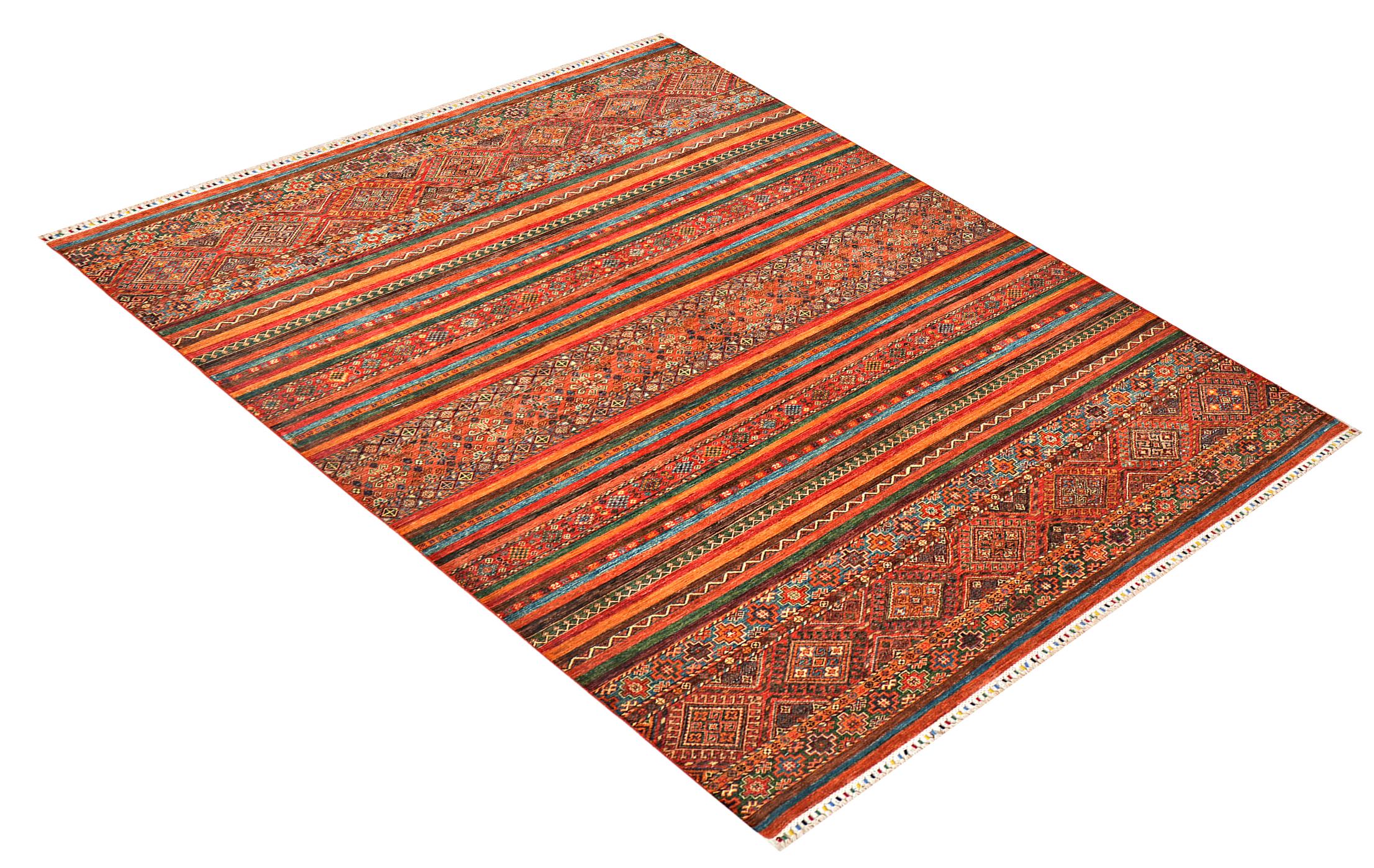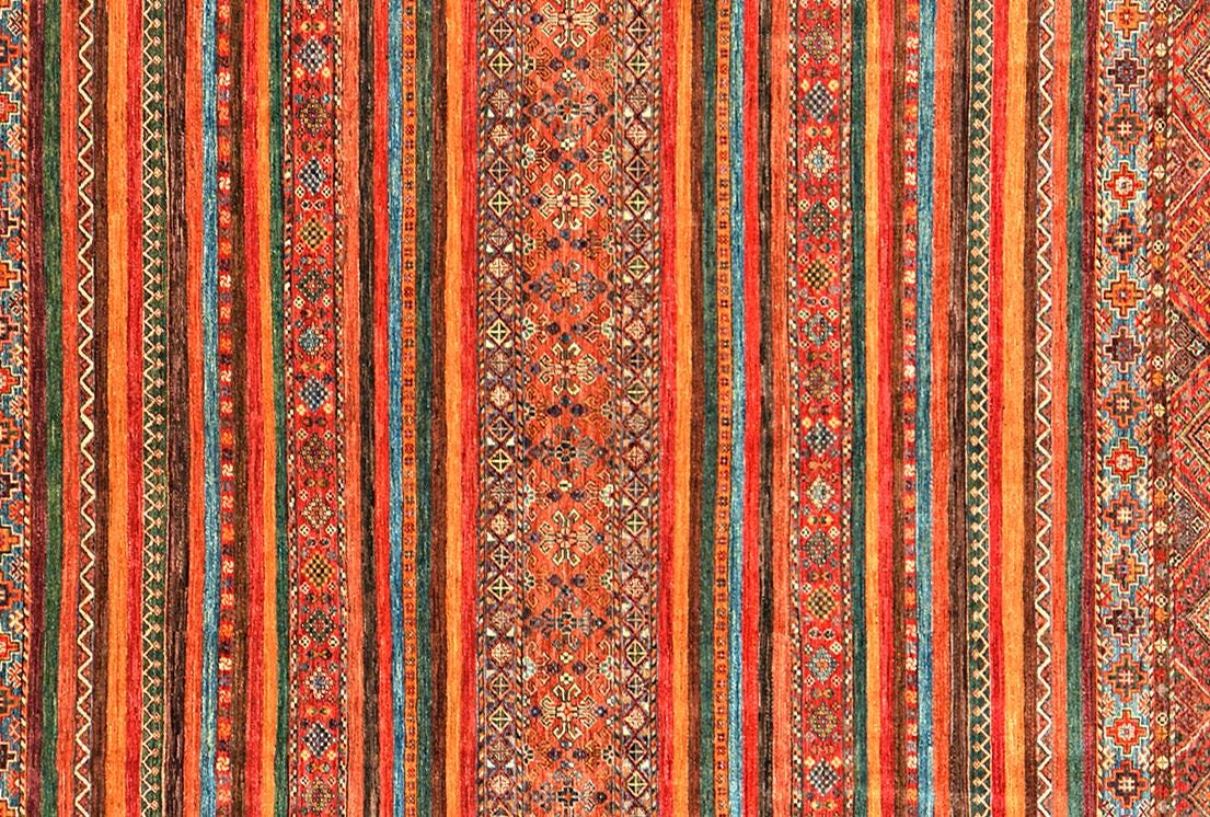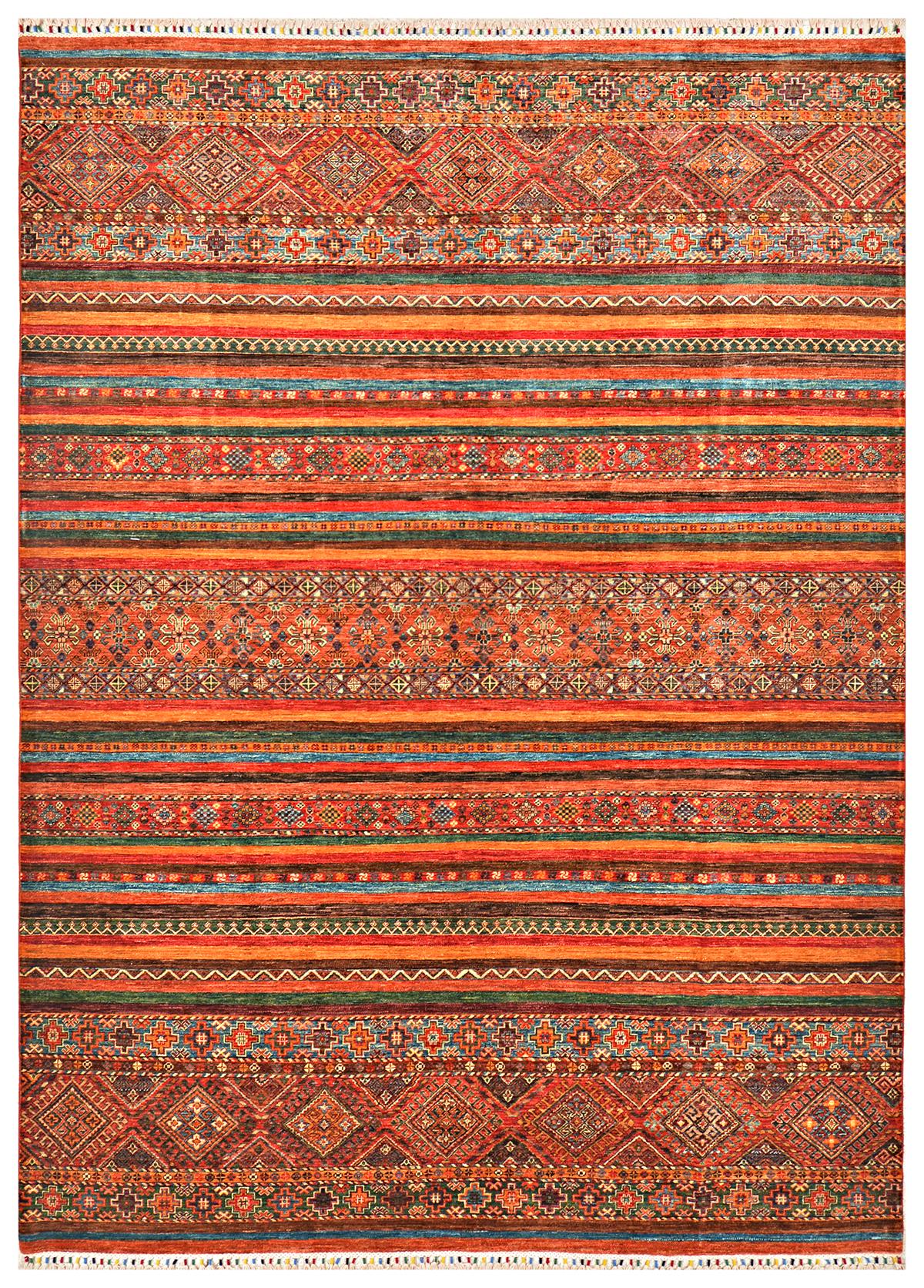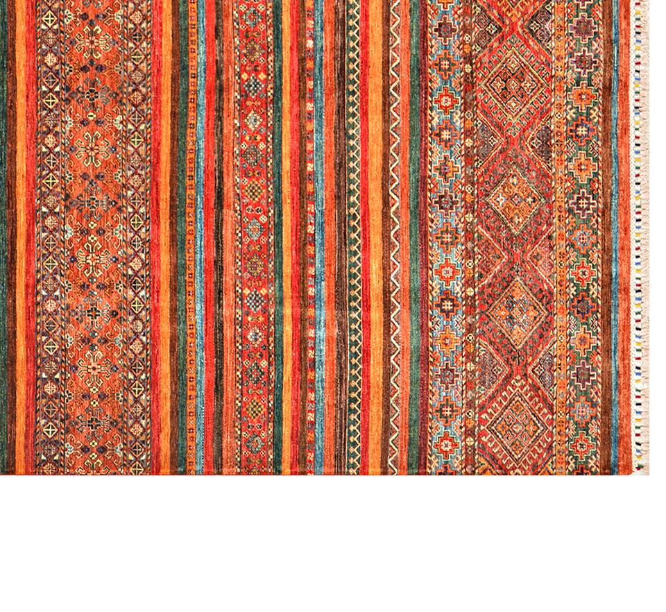 It features a mix of geometric and floral motifs, with shapes like diamonds and intricate border designs. The colours are rich and varied, including shades of red, blue, orange, and beige. This rug is 100% handmade which makes it one of a kind and unique. khurjeen rugs can be used for both modern and traditional settings. Very hard-wearing rug and a good value for money.