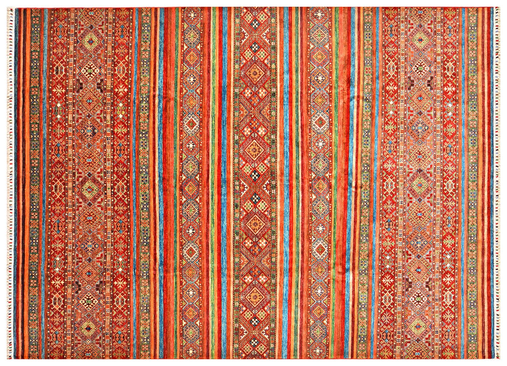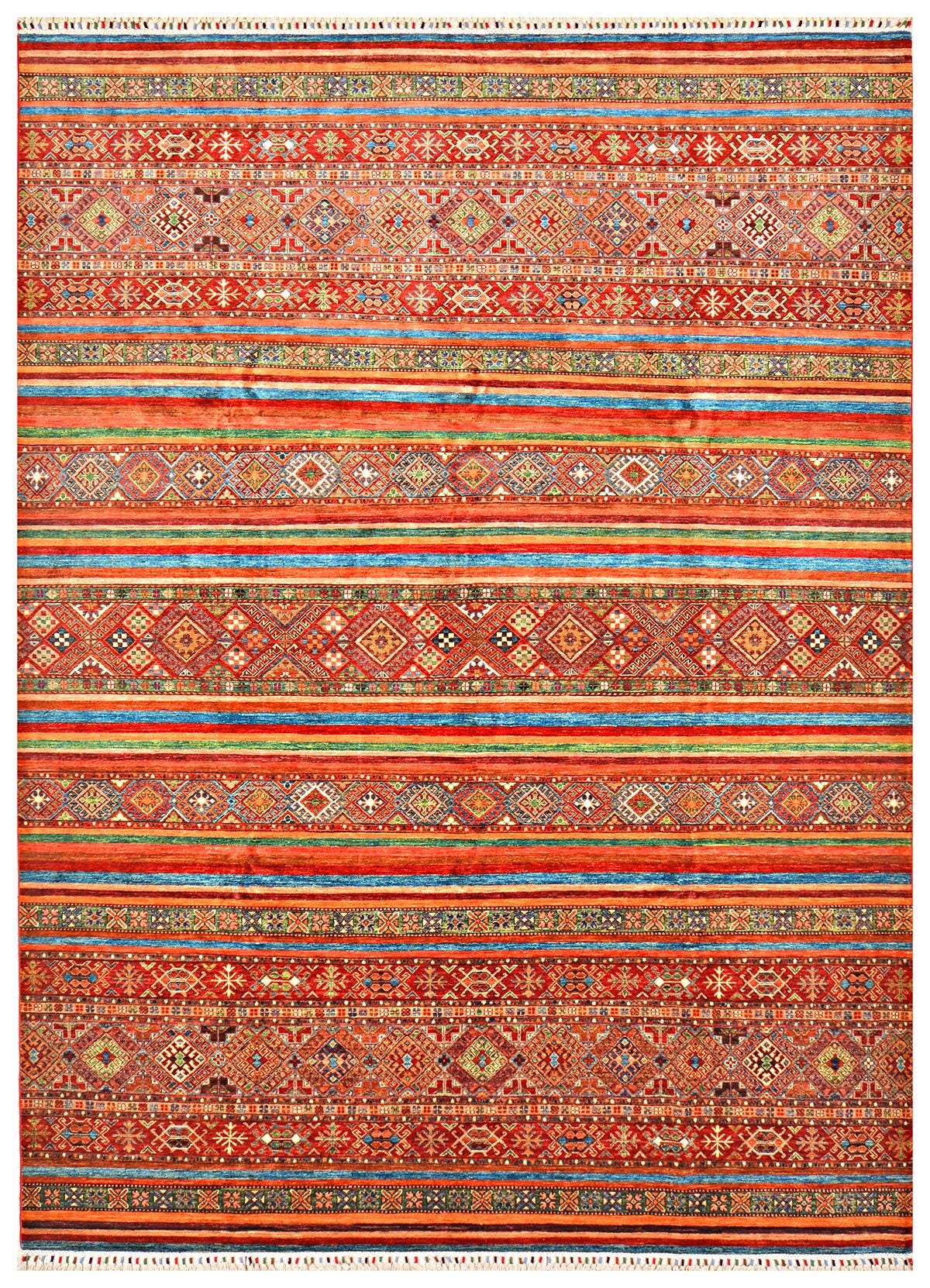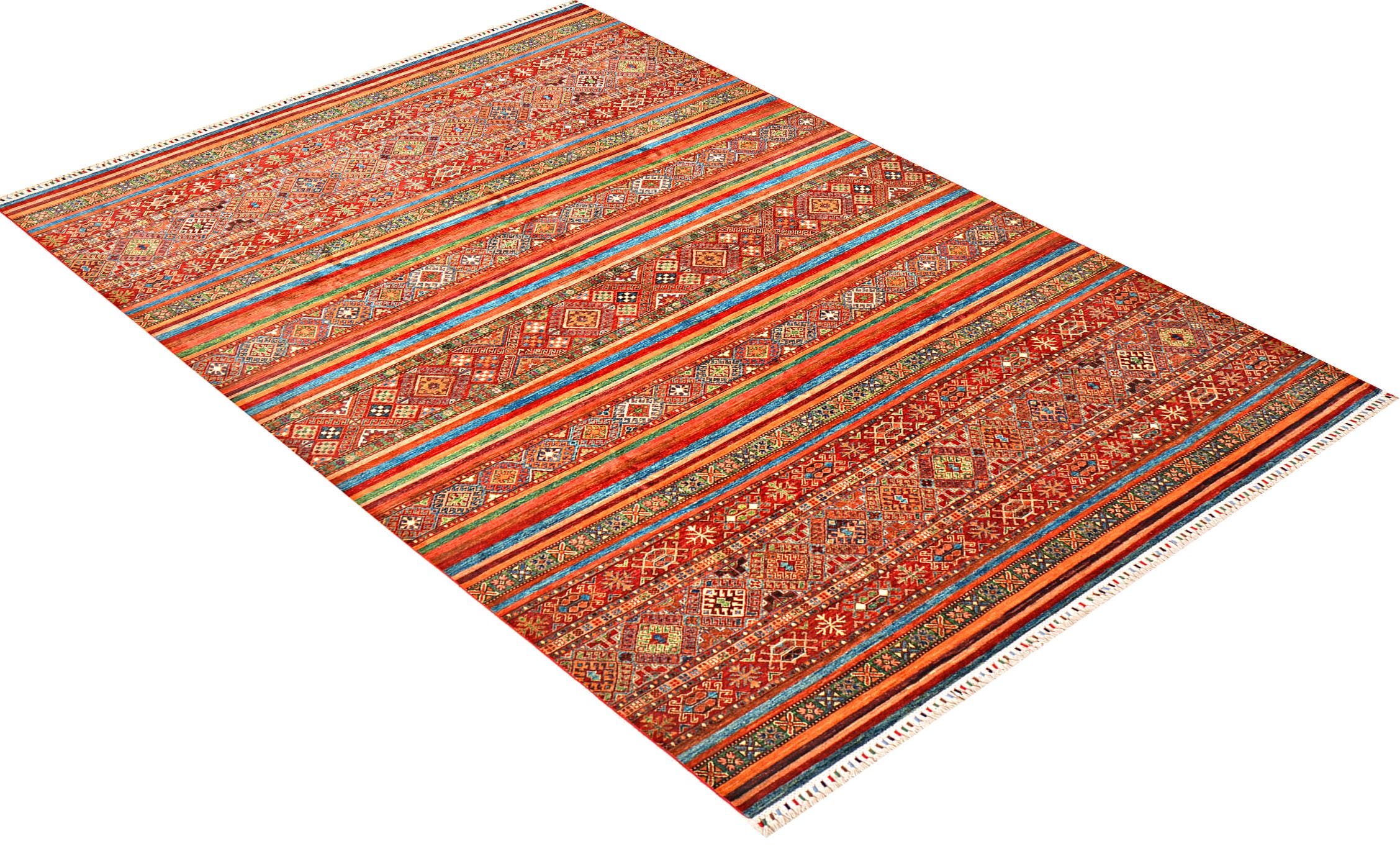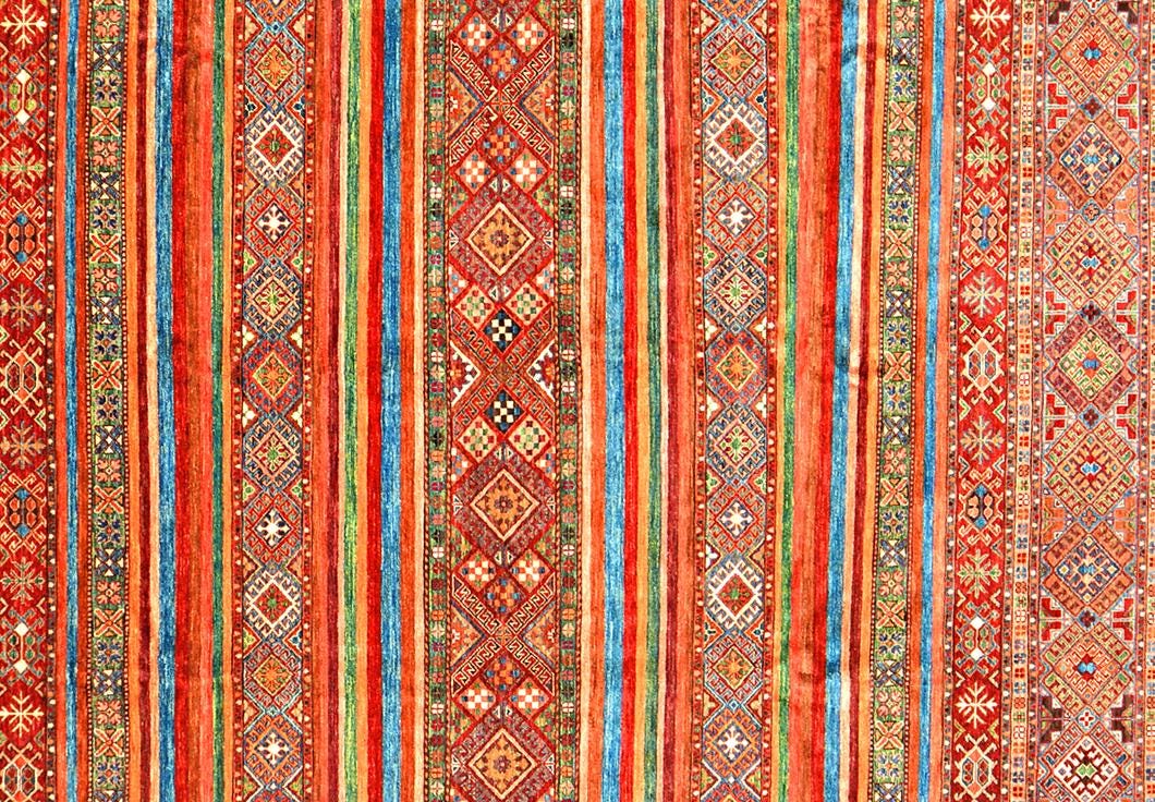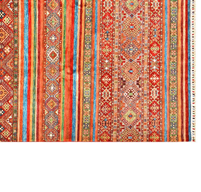 It features a mix of geometric and floral motifs, with shapes like diamonds and intricate border designs. The colours are rich and varied, including shades of red, blue, orange, and beige. This rug is 100% handmade which makes it one of a kind and unique. khurjeen rugs can be used for both modern and traditional settings. Very hard-wearing rug and a good value for money.