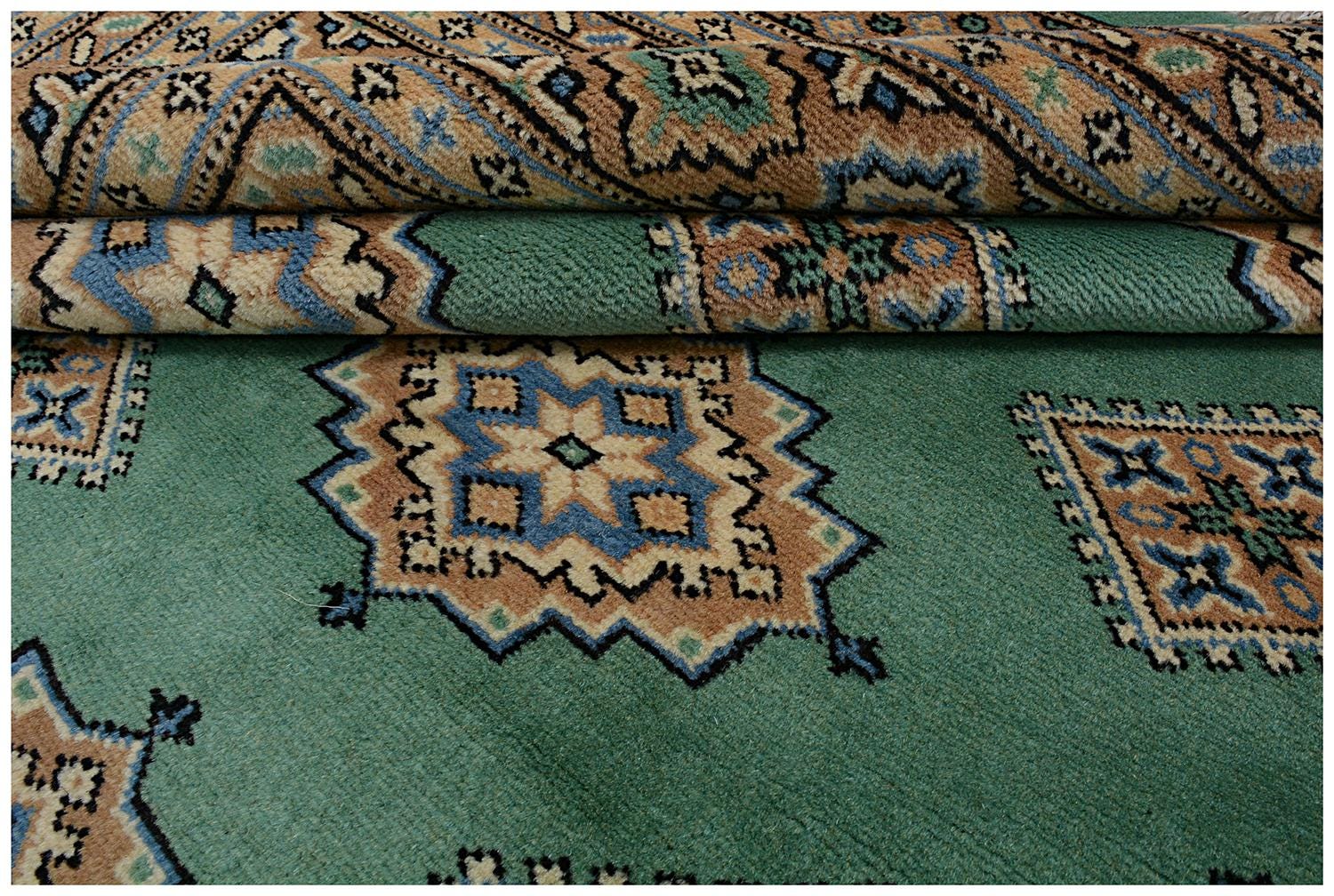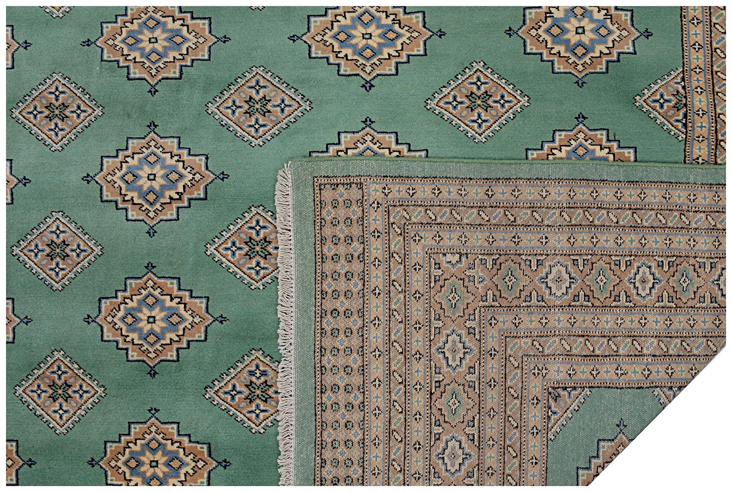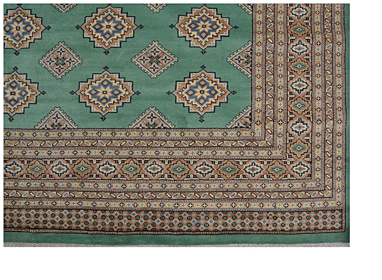 A brand new very high quality 100% handmade hand knotted Pakistan traditional Jaldar Bokhara rug in Gold and Green shades.