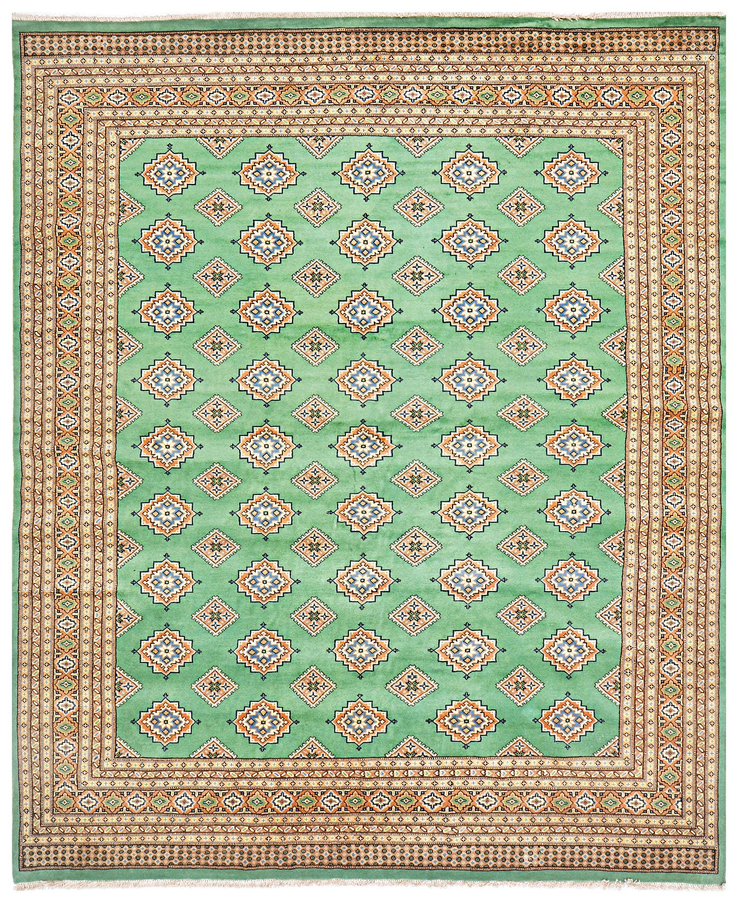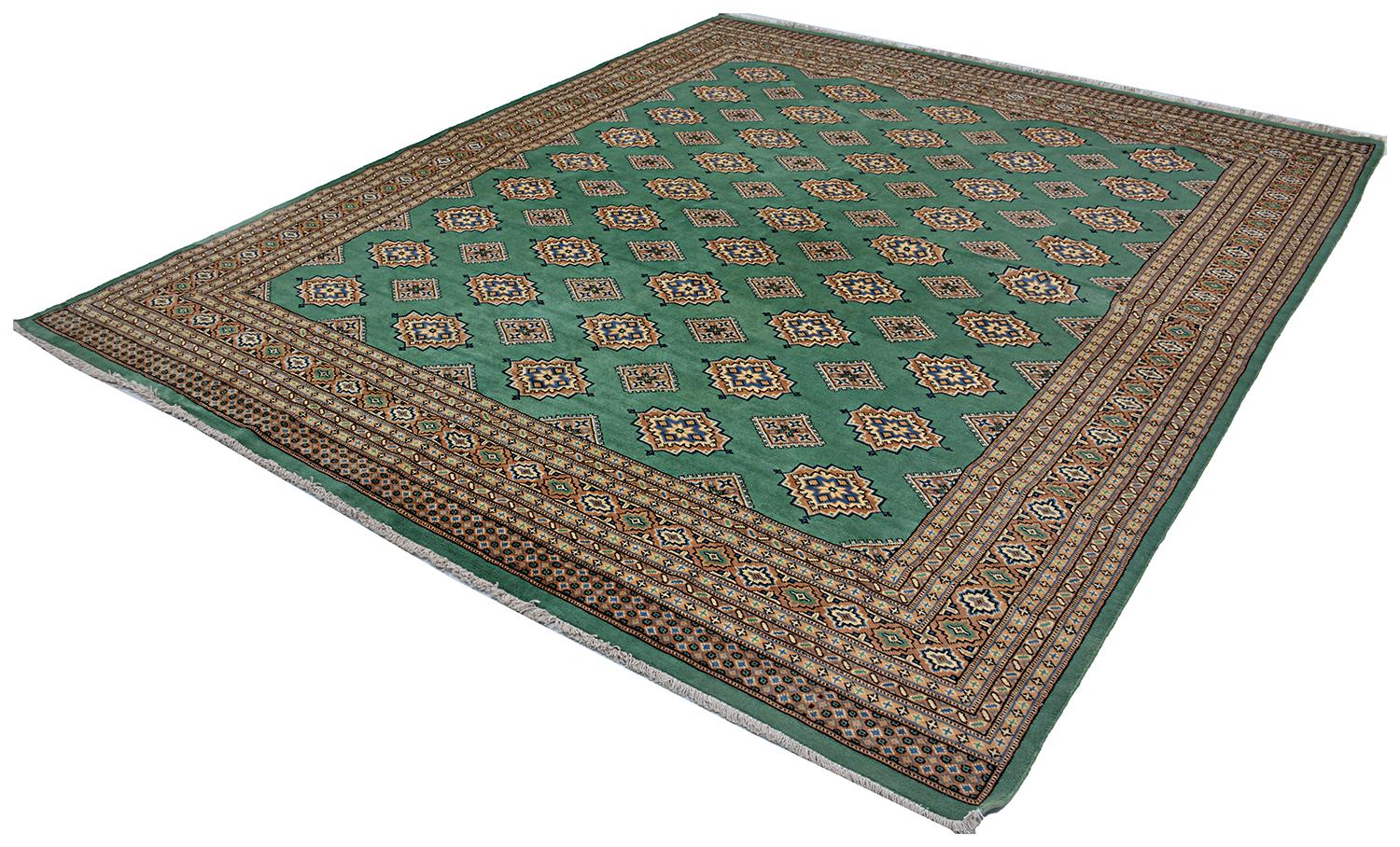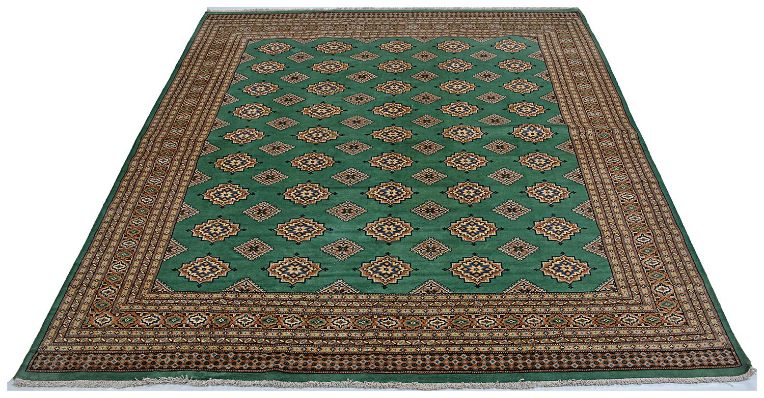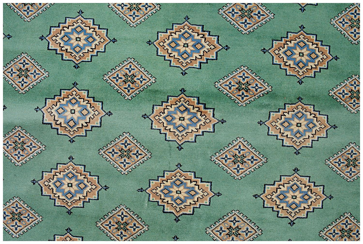 A brand new very high quality 100% handmade hand knotted Pakistan traditional Jaldar Bokhara rug in Gold and Green shades.