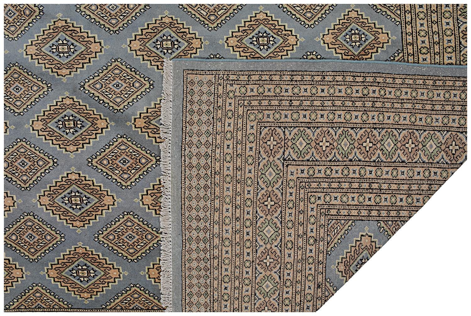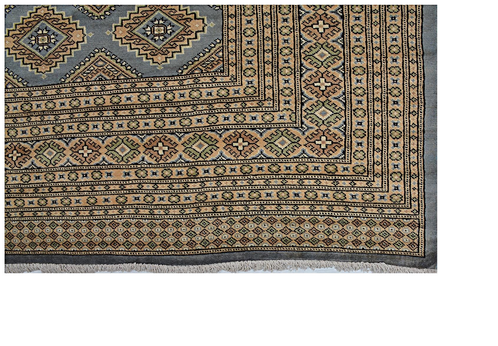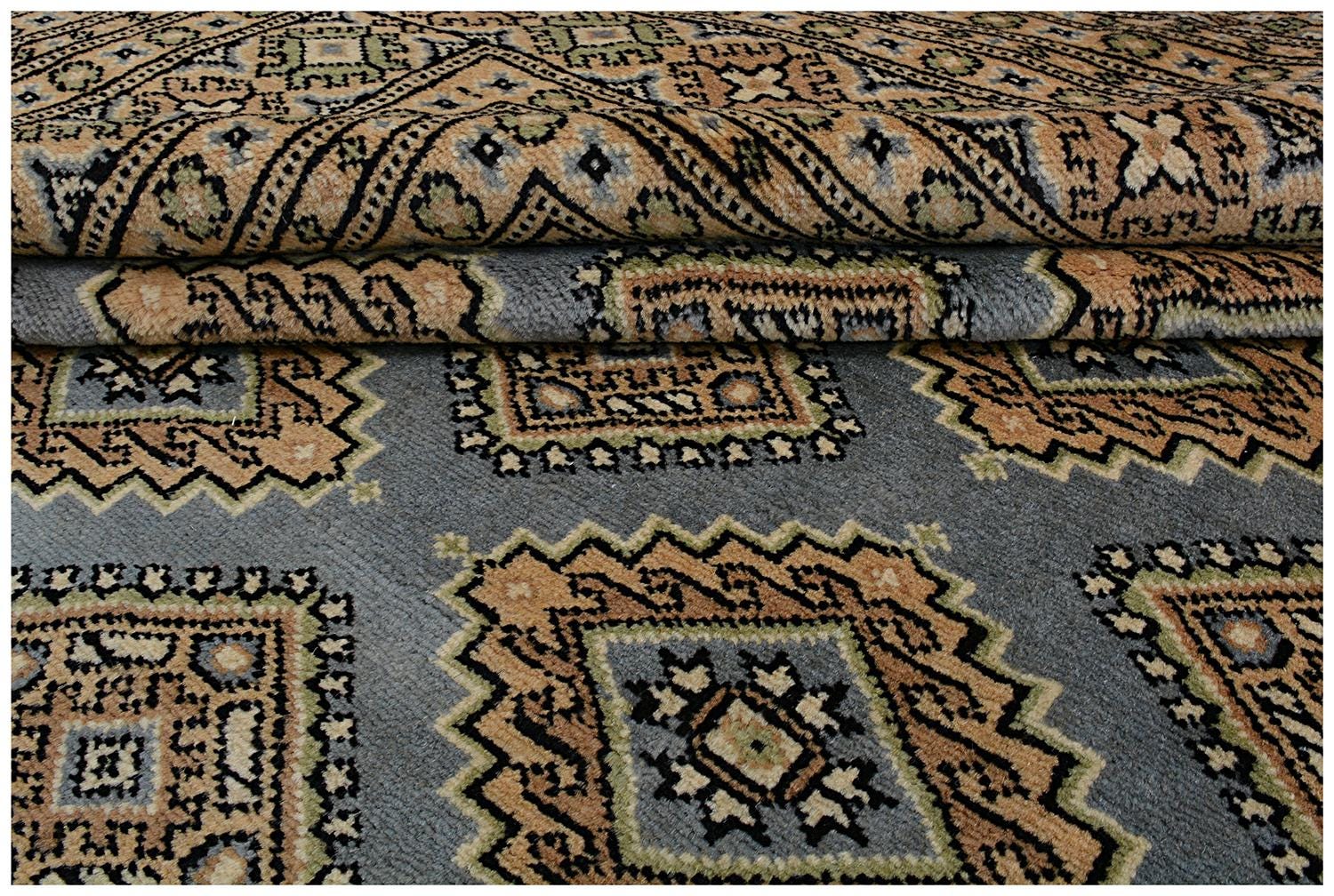 A brand new very high quality 100% handmade hand knotted Pakistan traditional Jaldar Bokhara rug in Gold and Grey shades.