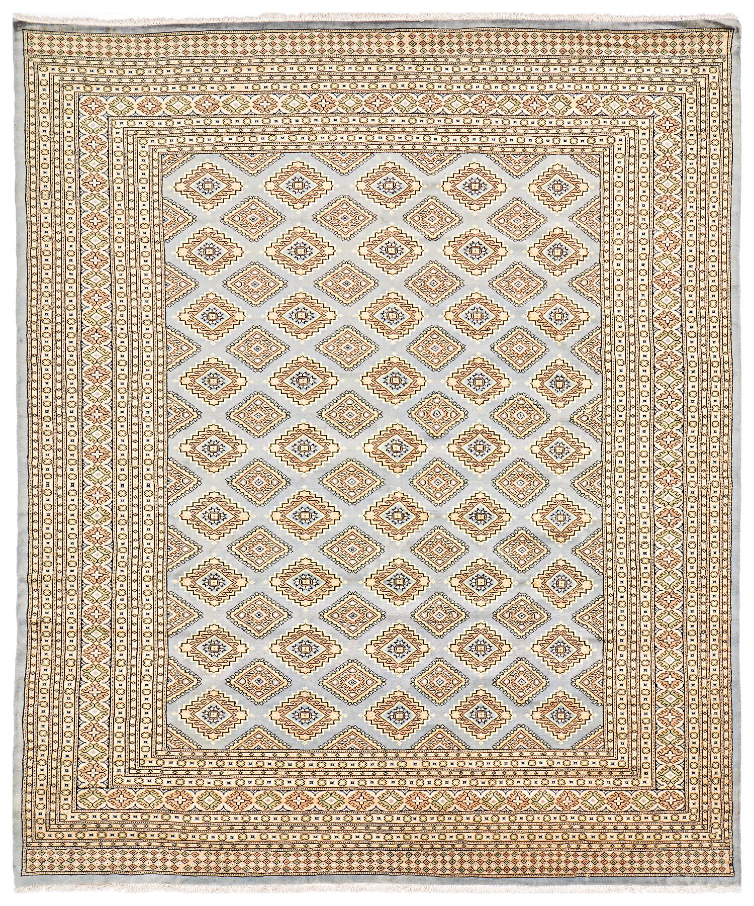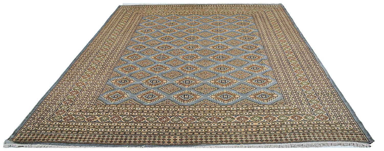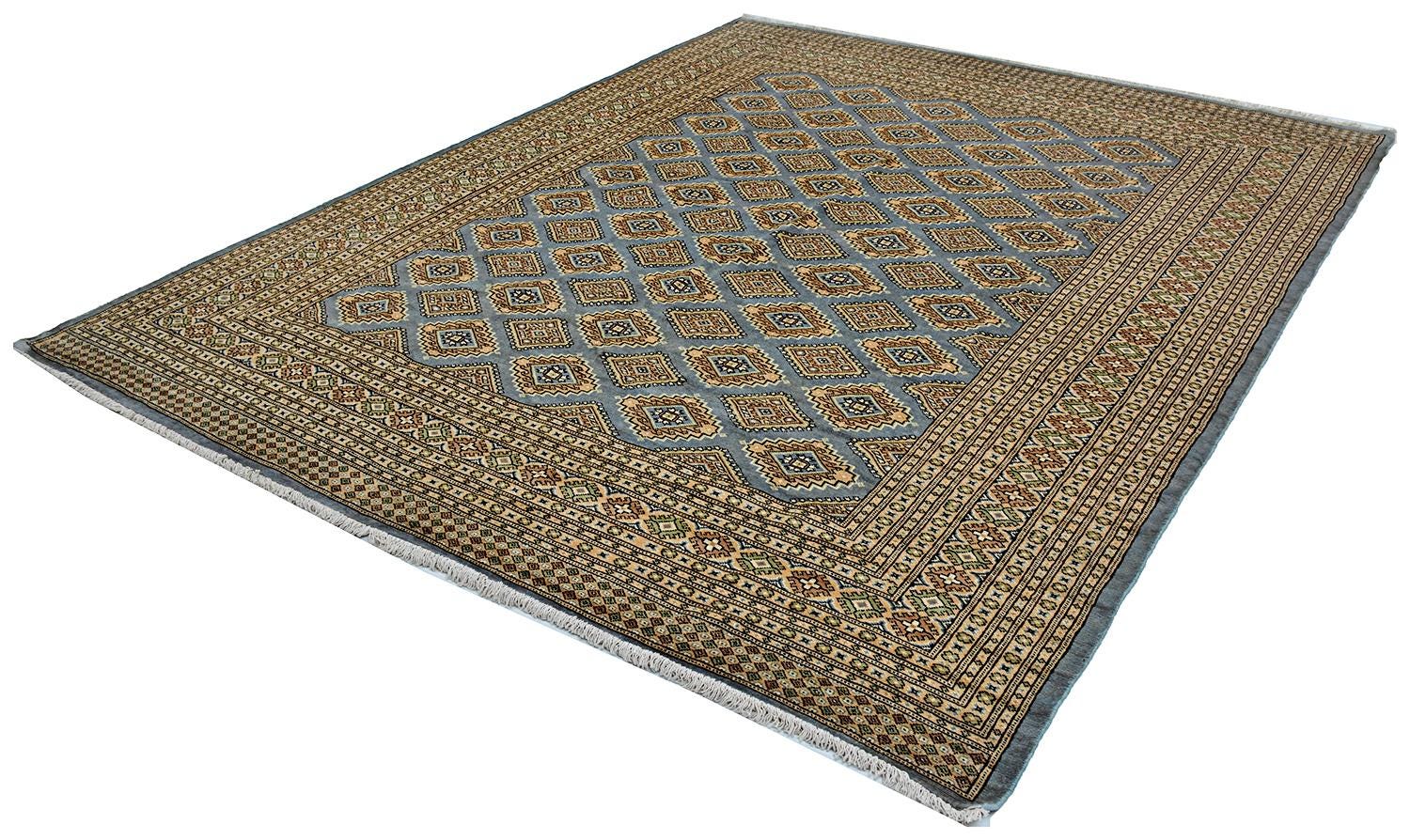A brand new very high quality 100% handmade hand knotted Pakistan traditional Jaldar Bokhara rug in Gold and Grey shades.