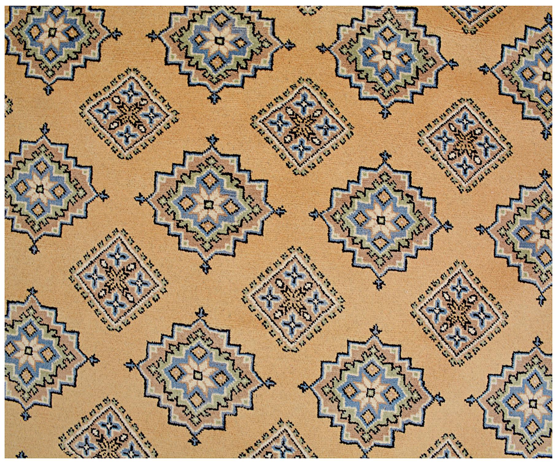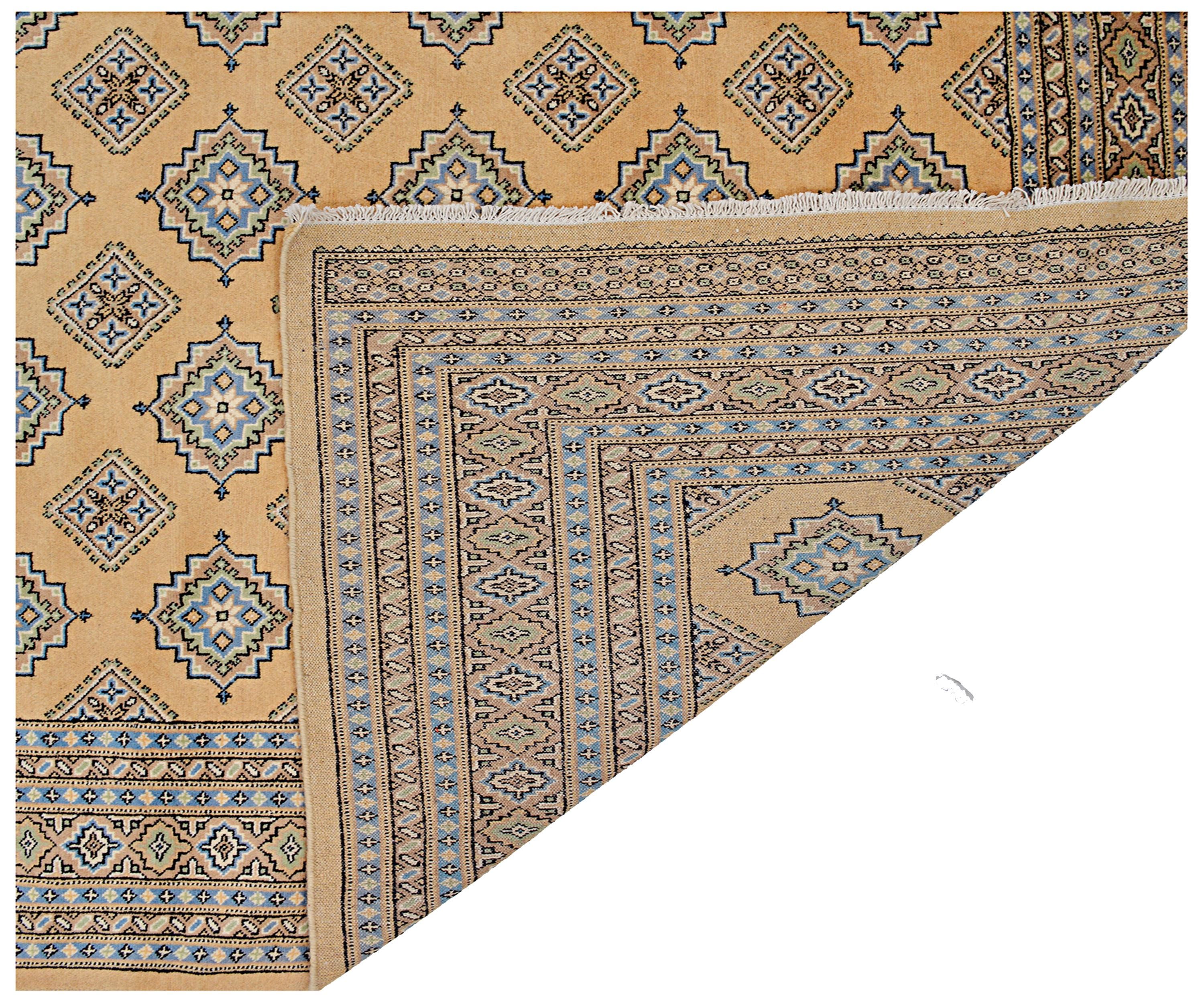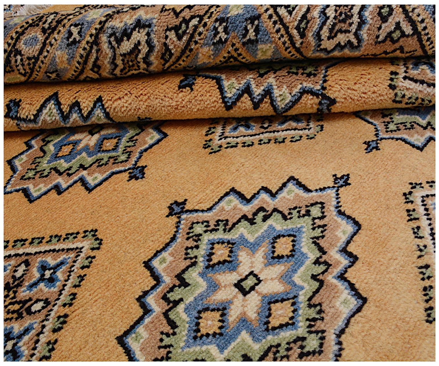 A brand new very high quality 100% handmade hand knotted Pakistan traditional Jaldar Bokhara rug in Gold, Black, Blue and Green shades.