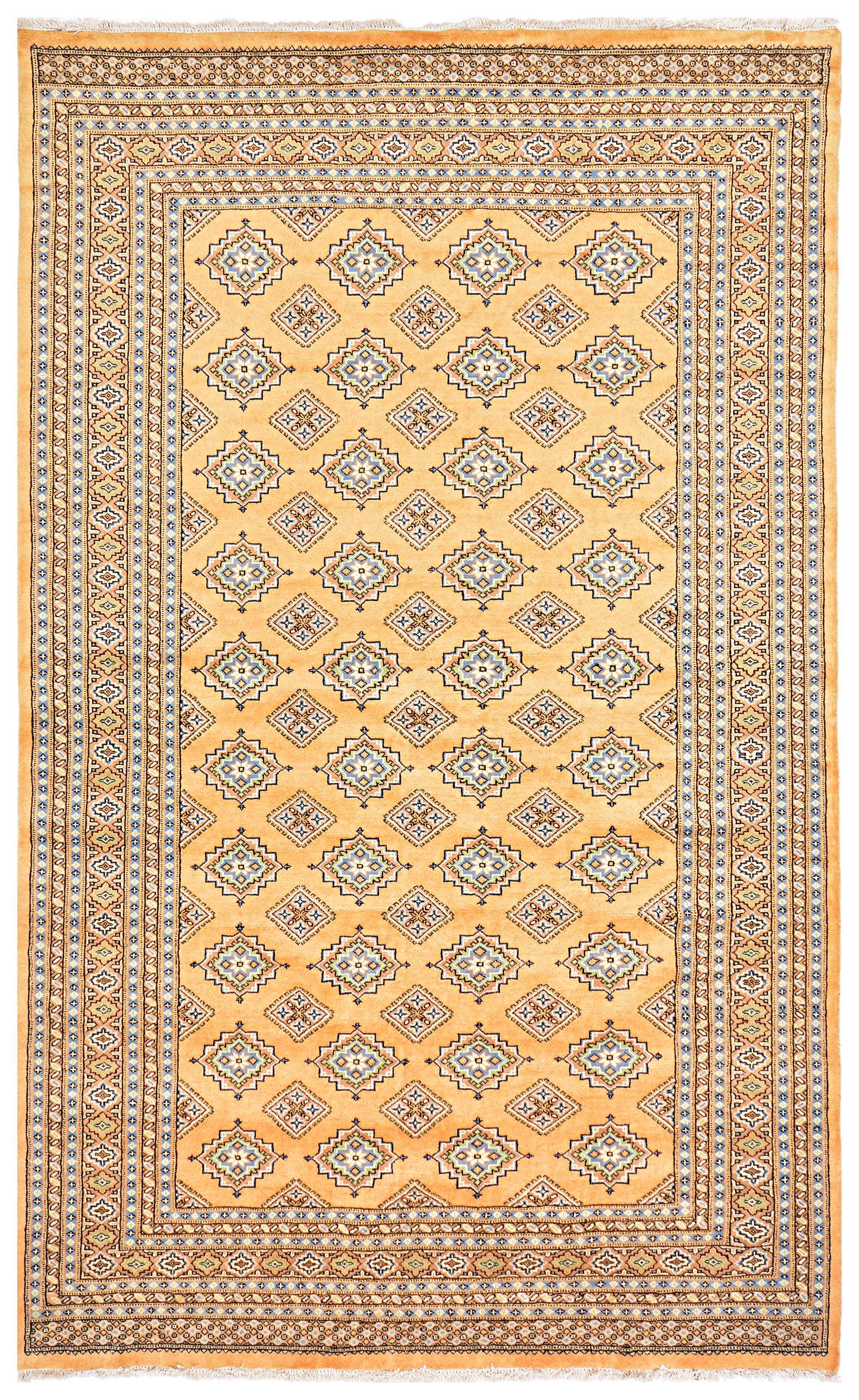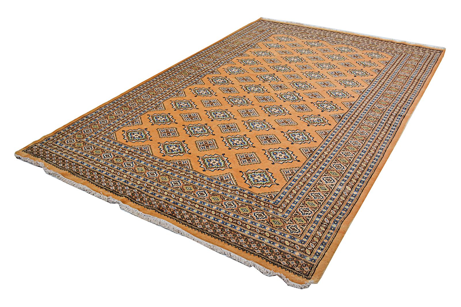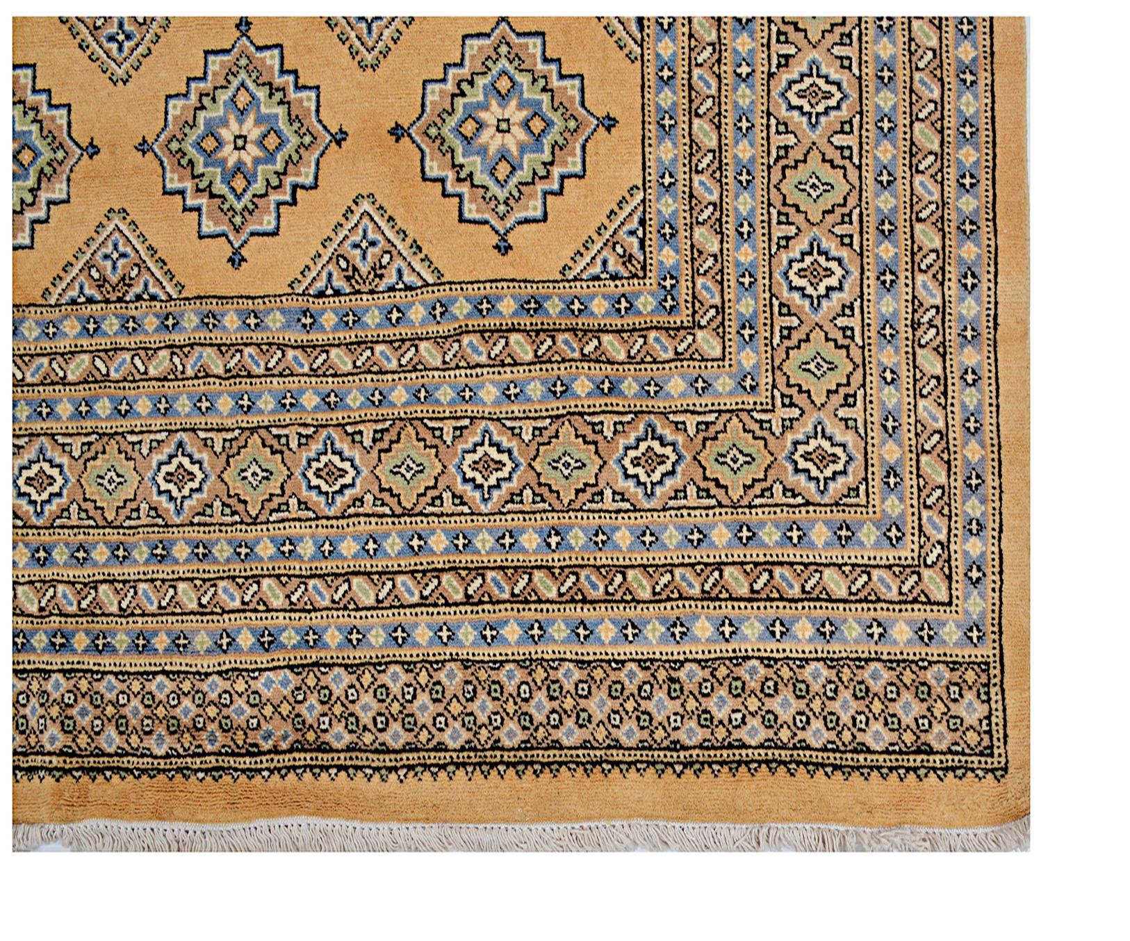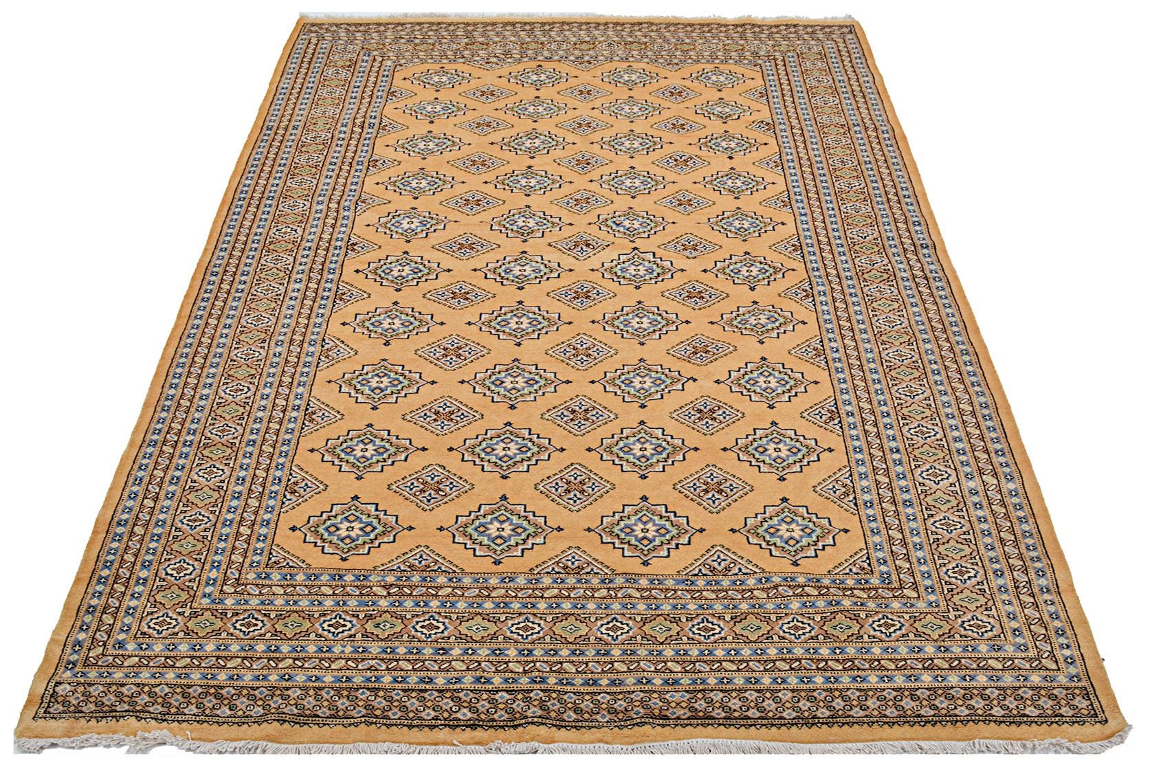 A brand new very high quality 100% handmade hand knotted Pakistan traditional Jaldar Bokhara rug in Gold, Black, Blue and Green shades.